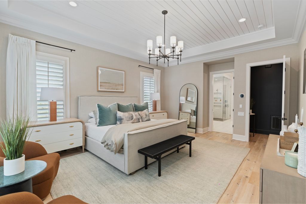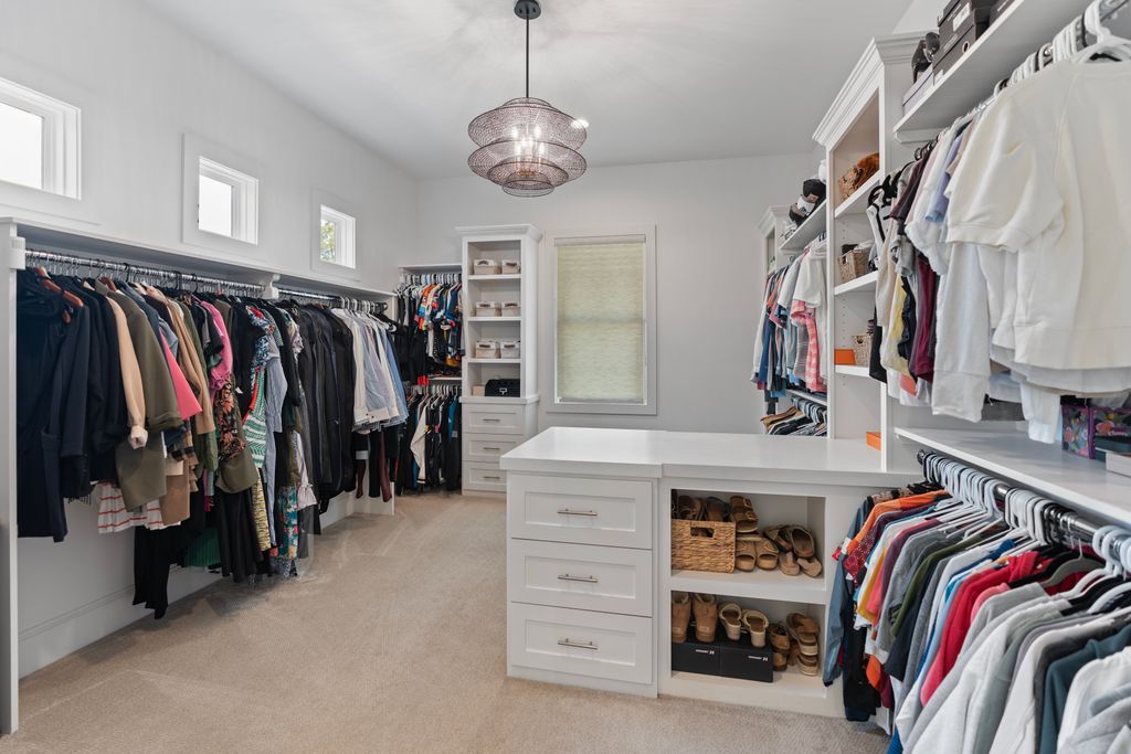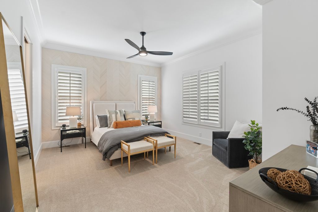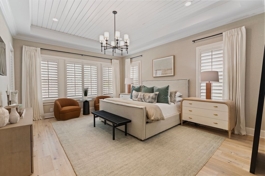 The primary suite is a private sanctuary on the main level, offering a spa-inspired bath and a fully customized dressing room. A generous guest suite with ensuite bath provides comfort and convenience for visitors.