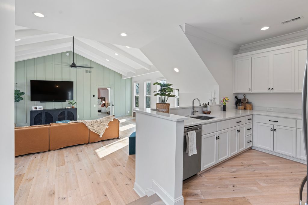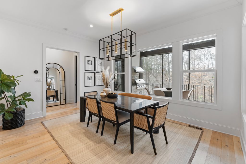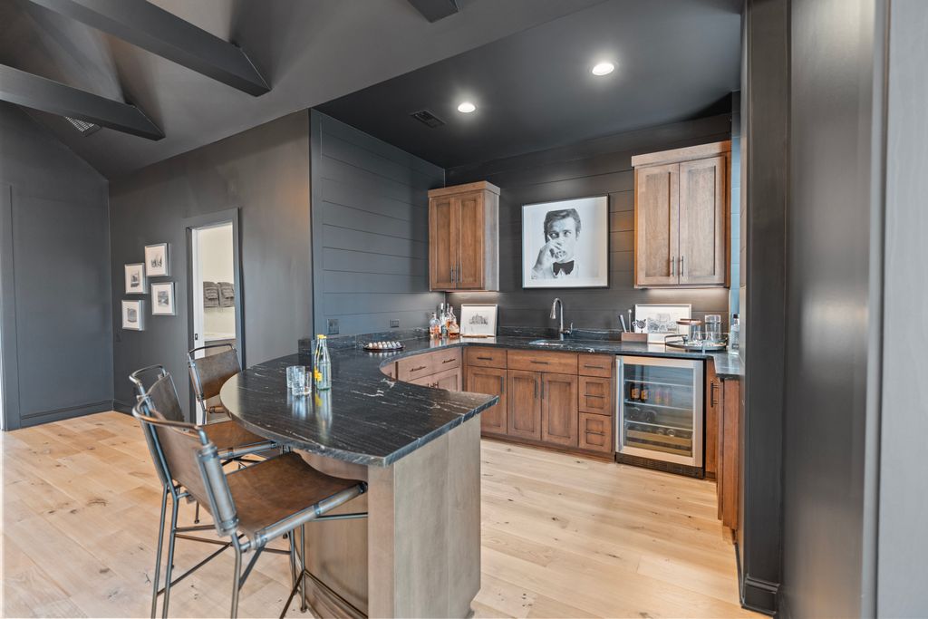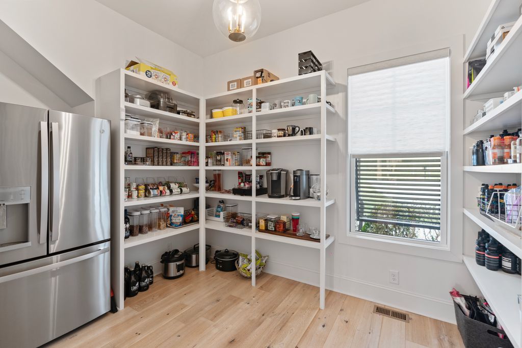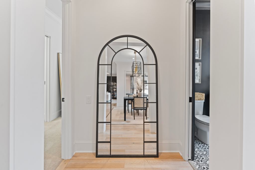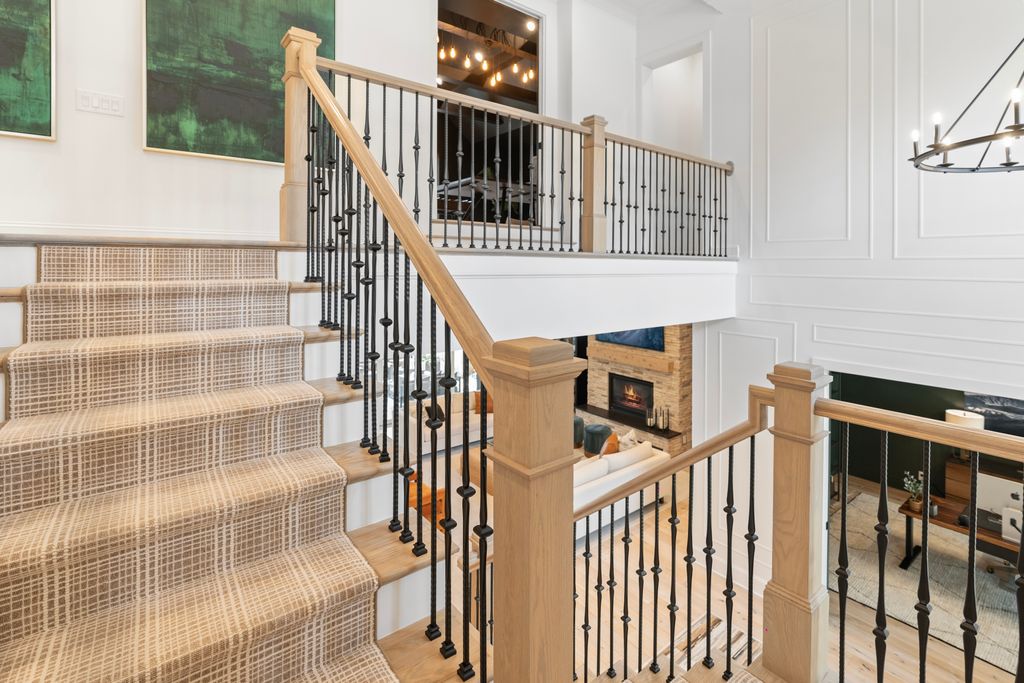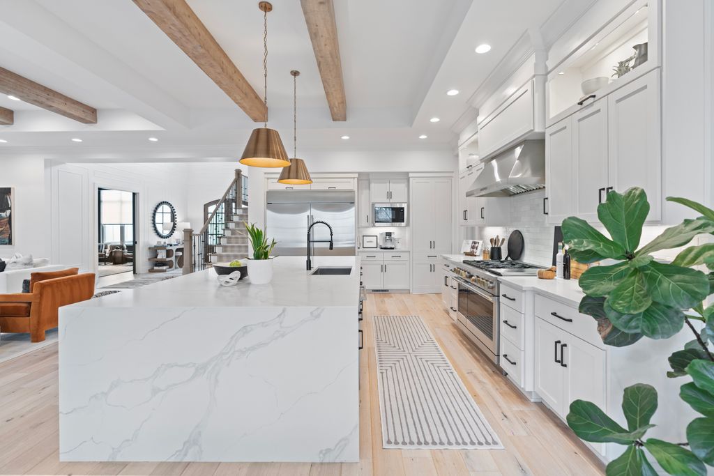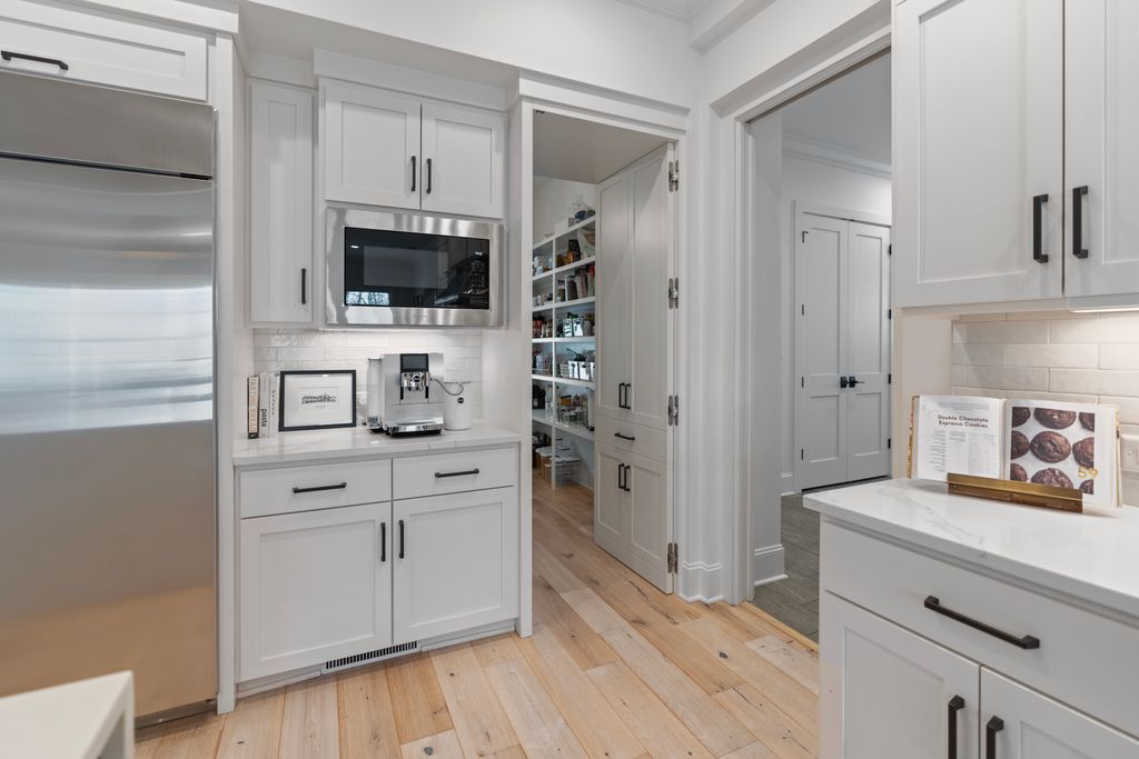 Surrounded by serene park and wooded views, the two-level residence offers both privacy and presence. The main level is anchored by a true chef’s kitchen featuring a dramatic quartz waterfall island, 72” integrated refrigerator/freezer, professional-grade appliances, and an expansive walk-in pantry complete with an additional 36” refrigerator - ideal for effortless entertaining.