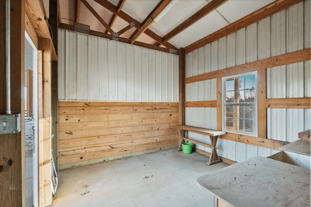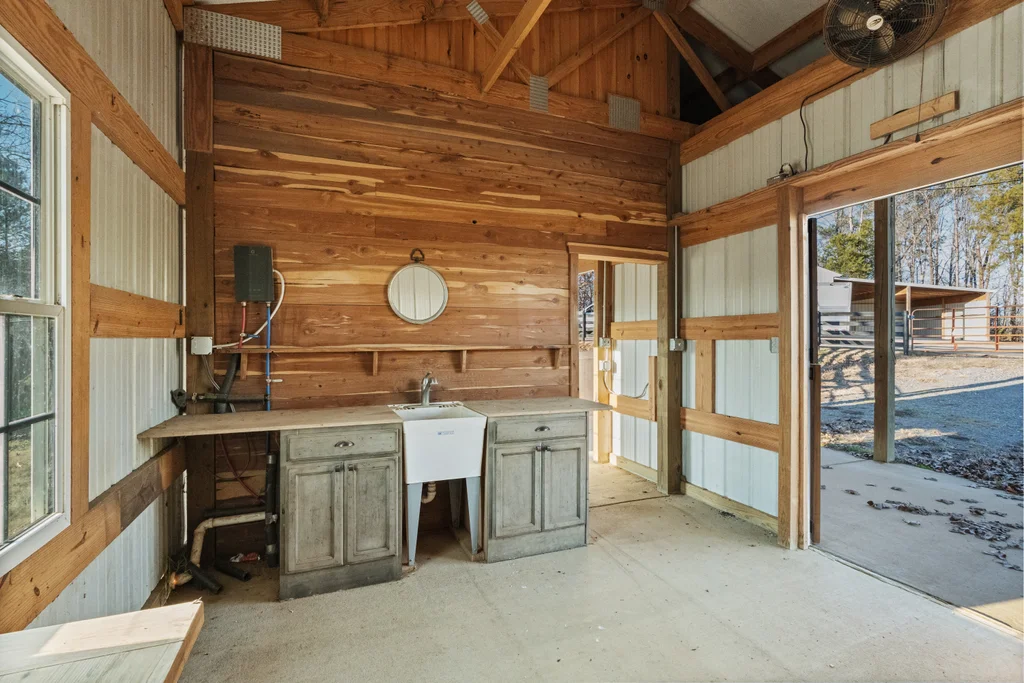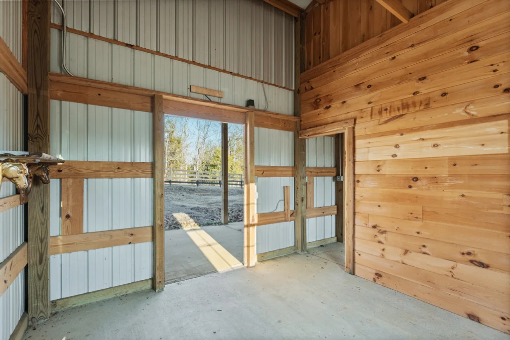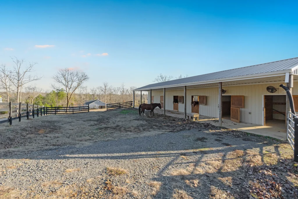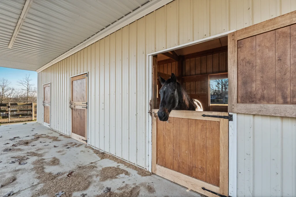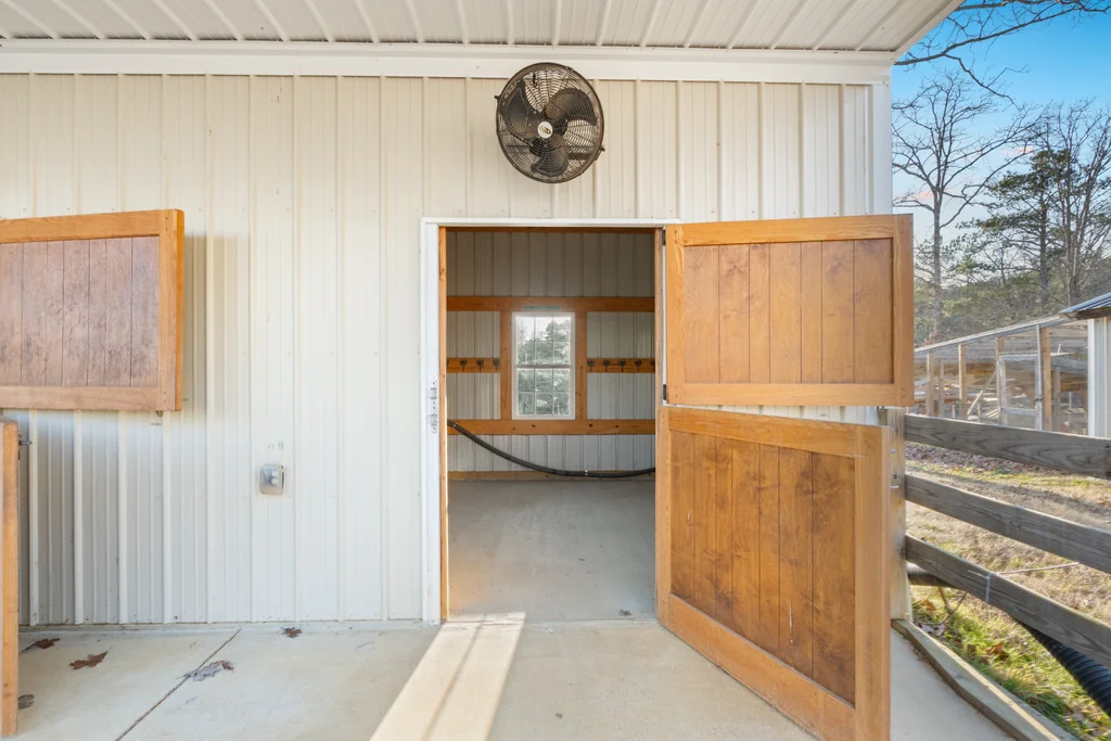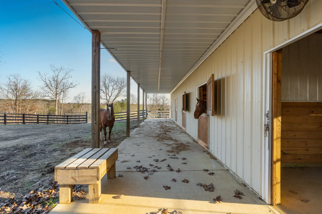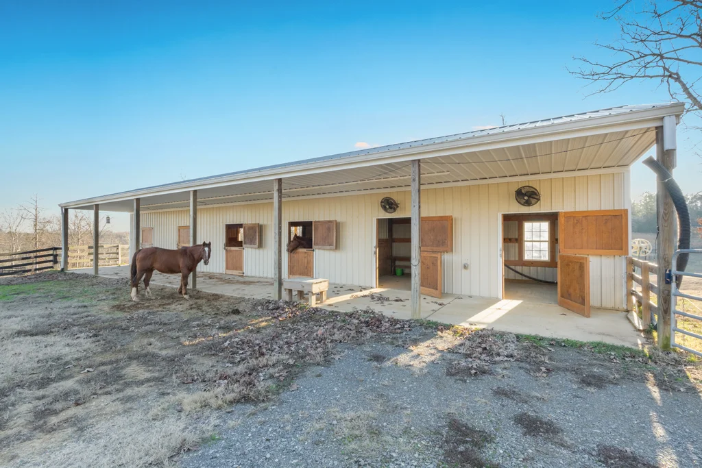 4 Stalls, tack room, feed room, Over hangs on front and back. Water / power equipped. Fans in each stall