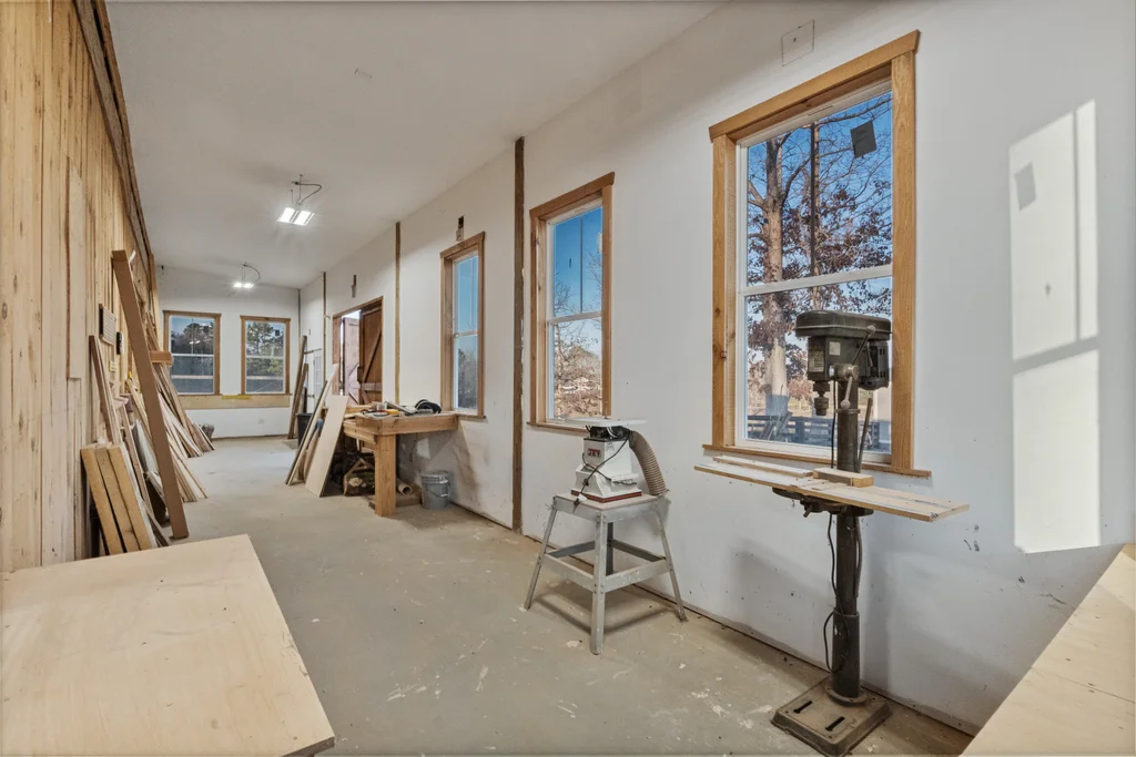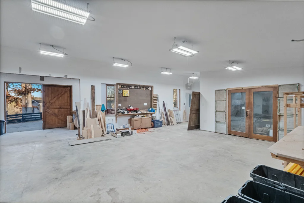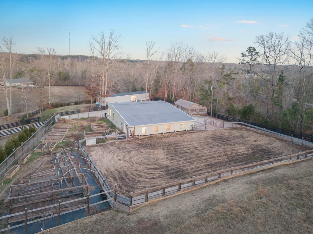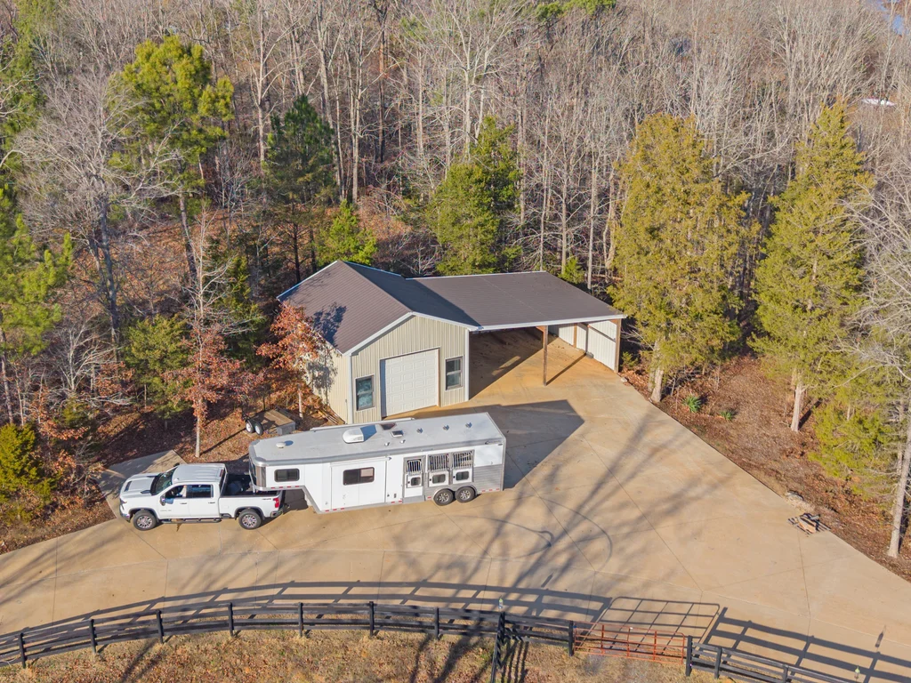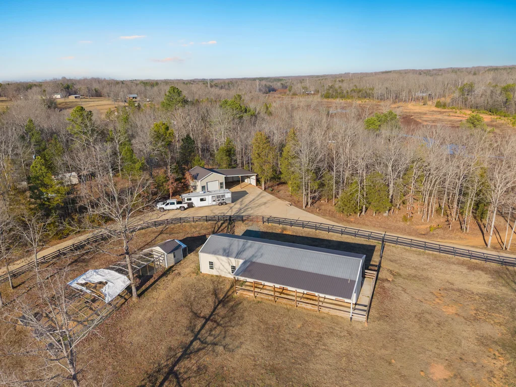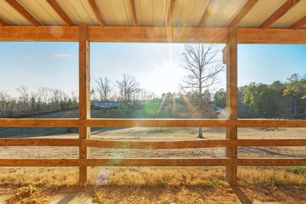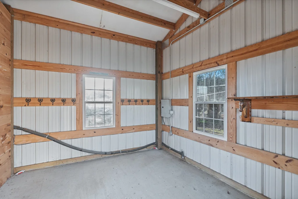 4 Stalls, tack room, feed room, Over hangs on front and back. Water / power equipped. Fans in each stall