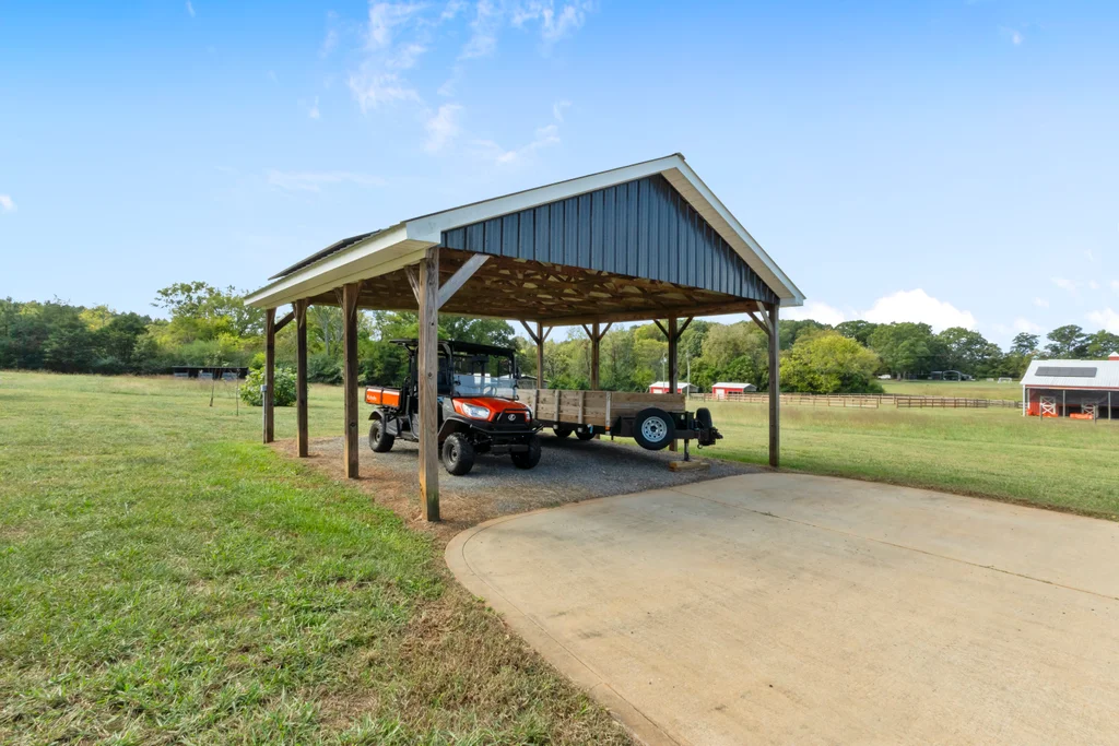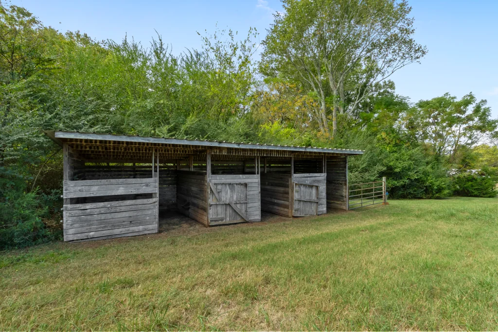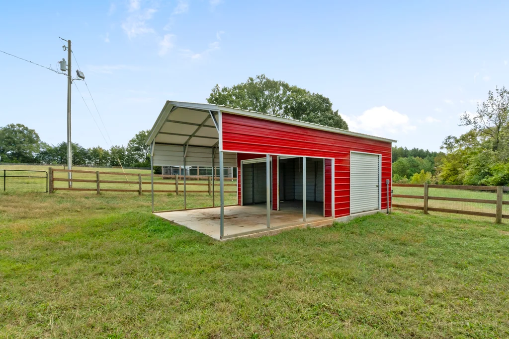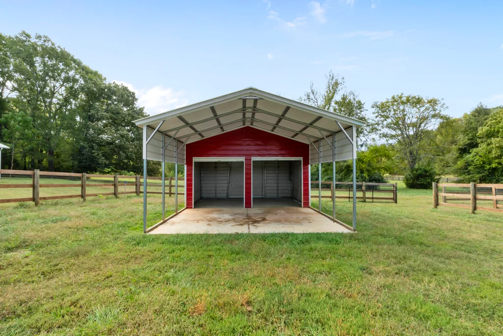* A 4-stall barn with a large tack room, feed storage, and wide overhangs on each side.